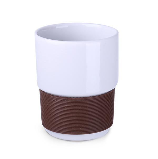 Mittelgroßer Werbebecher aus Porzellan ohne Henkel. 40 mm breite Bänder, erhältlich in 7 Farben: weiß, orange, rot, grün, marineblau, braun und schwarz.
