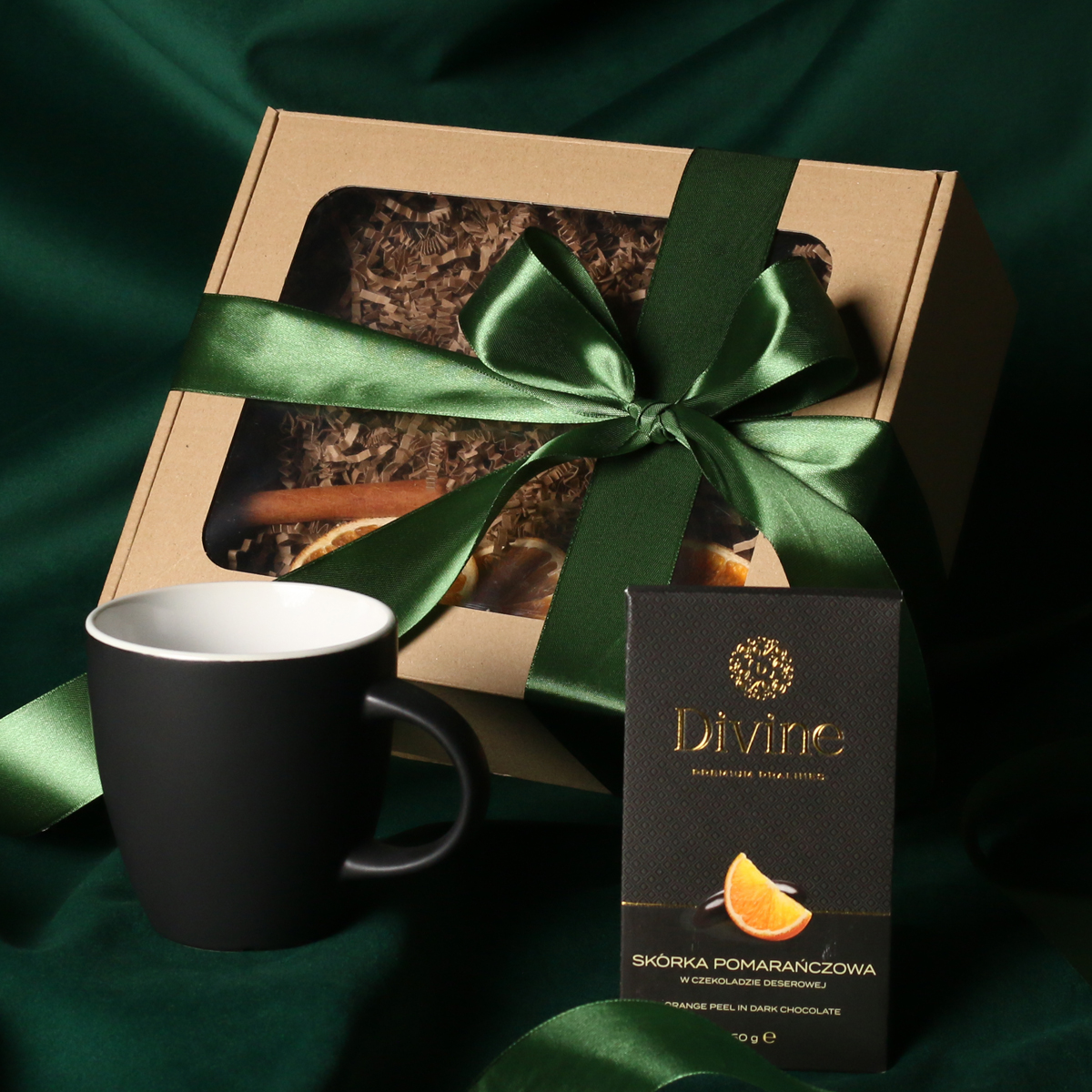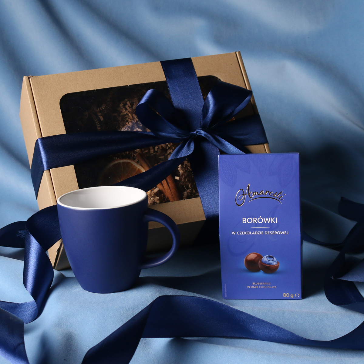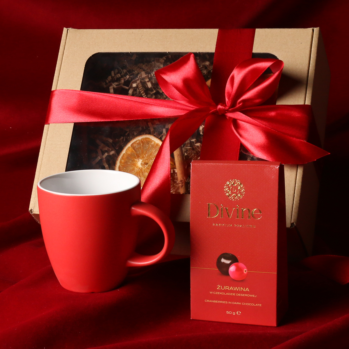 Zum Set gehören: Fiord-Becher rot-weiß / marineblau-weiß / schwarz-weiß mit Veredelungsmöglichkeit, Divine Pralines – Cranberries in Schokolade (rot) / Heidelbeeren in Schokolade (marineblau) / Orangenschale in Schokolade (schwarz). Alles in einer stilvollen Eco-Kartonverpackung mit Sichtfenster. Zusätzliche Personalisierungsoptionen: Druck auf dem Becher, Anhänger mit Firmenlogo, Schleife oder Banderole mit winterlichem Motiv, veredelt mit Goldprägung.