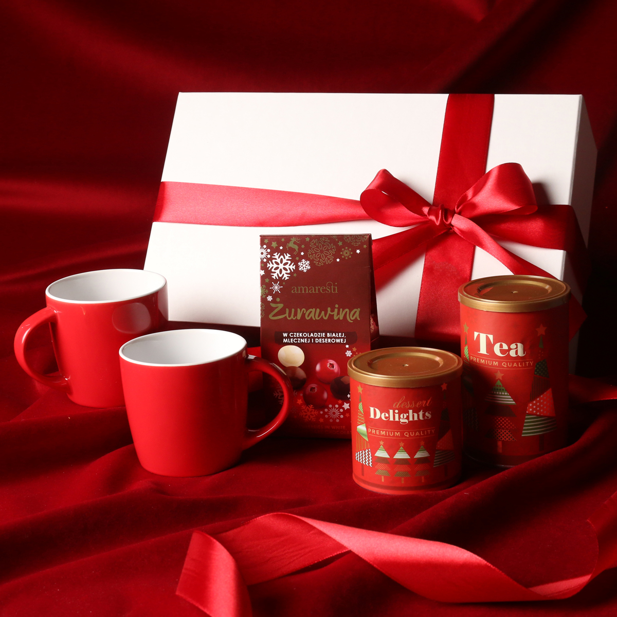 Ikonische Handy-Becher in Rot Cranberry-Pralinen in weißer, Milch- und Zartbitterschokolade Delicate Delights Pralinen – schwarze Johannisbeeren in weißer Schokolade mit Himbeerpulver 80g Aromatischer grüner Sencha-Tee mit Kirschen, Rosenblättern und Ginkgo-Biloba-Blättern 80g Exklusive Verpackung mit Magnetverschluss und Möglichkeit, passendes Band oder Banderole hinzuzufügen